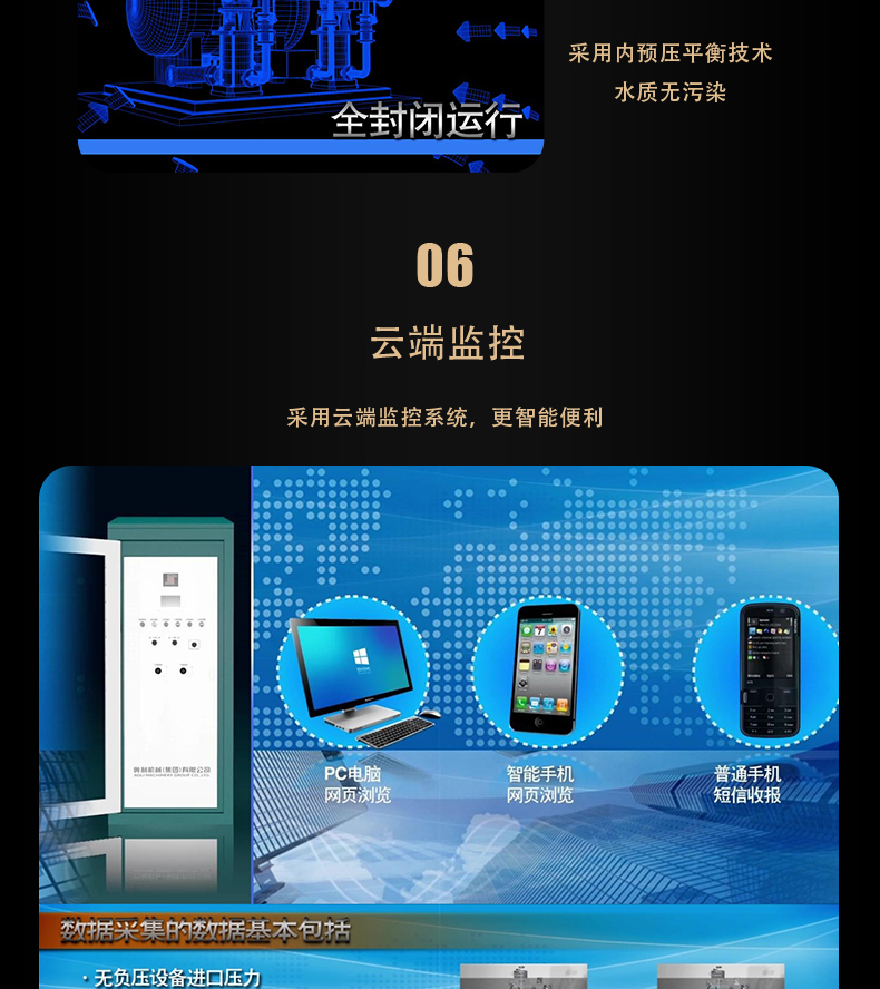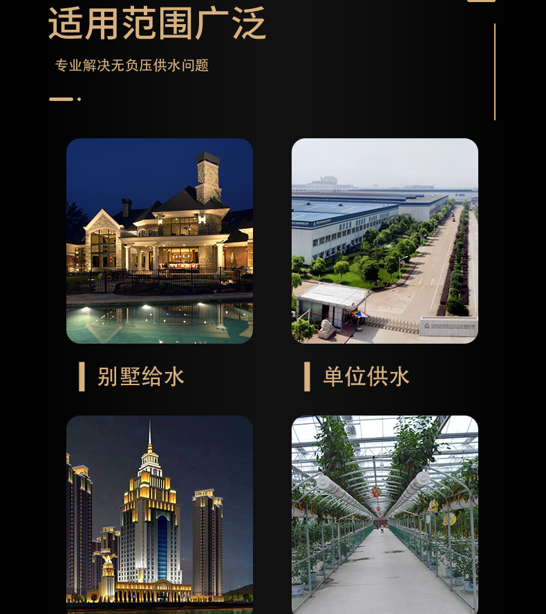 ALCW-F第五代無負(fù)壓供水設(shè)備是以市政管網(wǎng)為水源,充分利用了市政管網(wǎng)原有的壓力,形成密閉的連續(xù)接力增壓供水方式,節(jié)能效果好,沒有水質(zhì)的二次污染,是變頻恒壓供水設(shè)備的發(fā)展與延伸。適用于任何壓力不足的區(qū)域;住宅小區(qū)、寫字樓、商場(chǎng)、學(xué)校、部隊(duì)、工廠、浴池、景區(qū)、政府辦公樓、老舊泵房改造等;工礦企業(yè)的生產(chǎn)生活用水,各種循環(huán)用水系統(tǒng)。