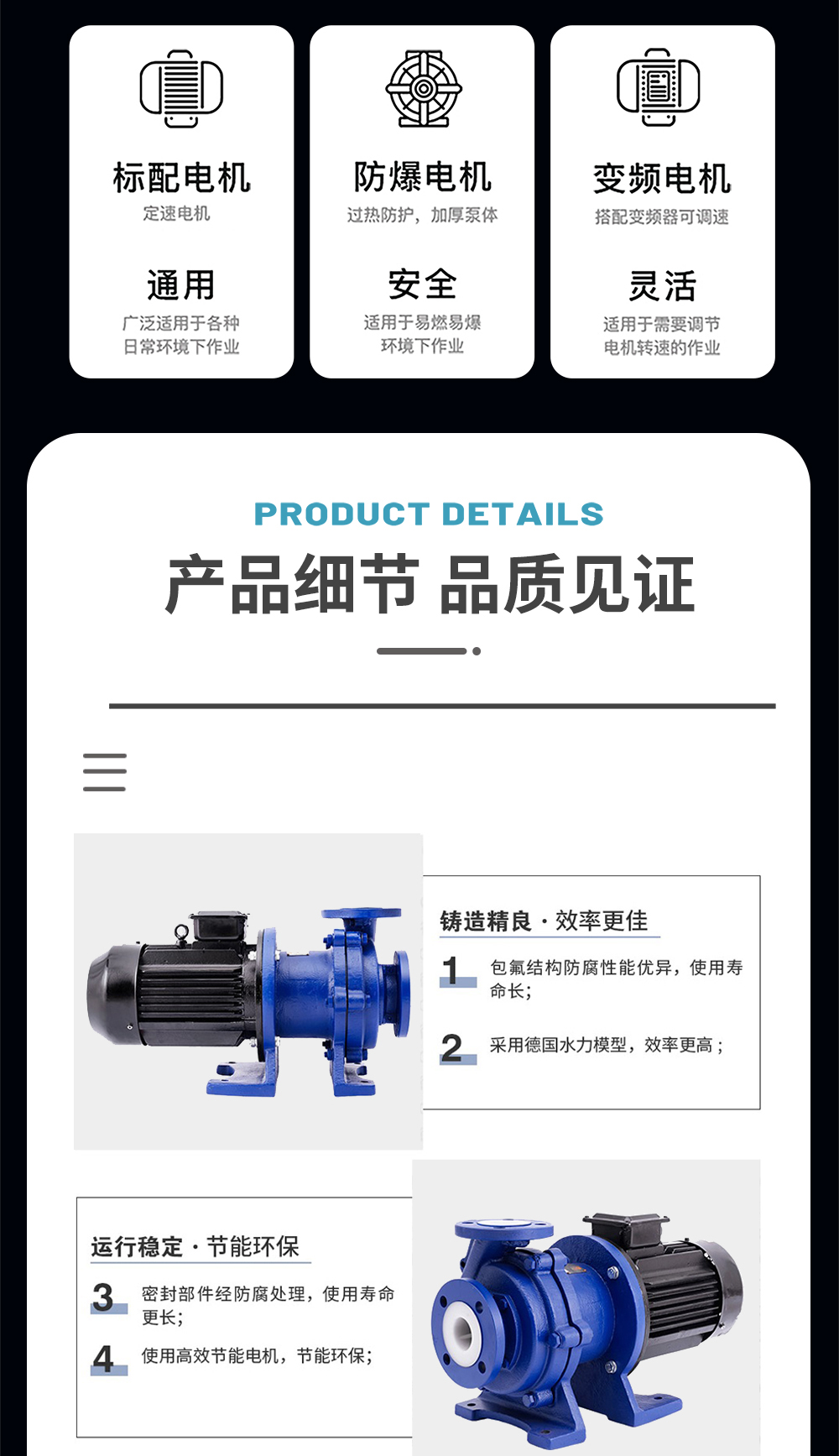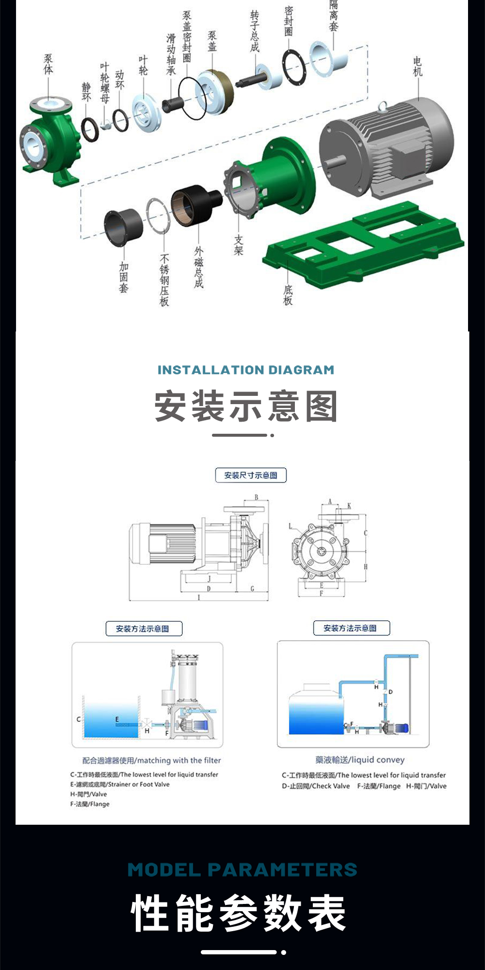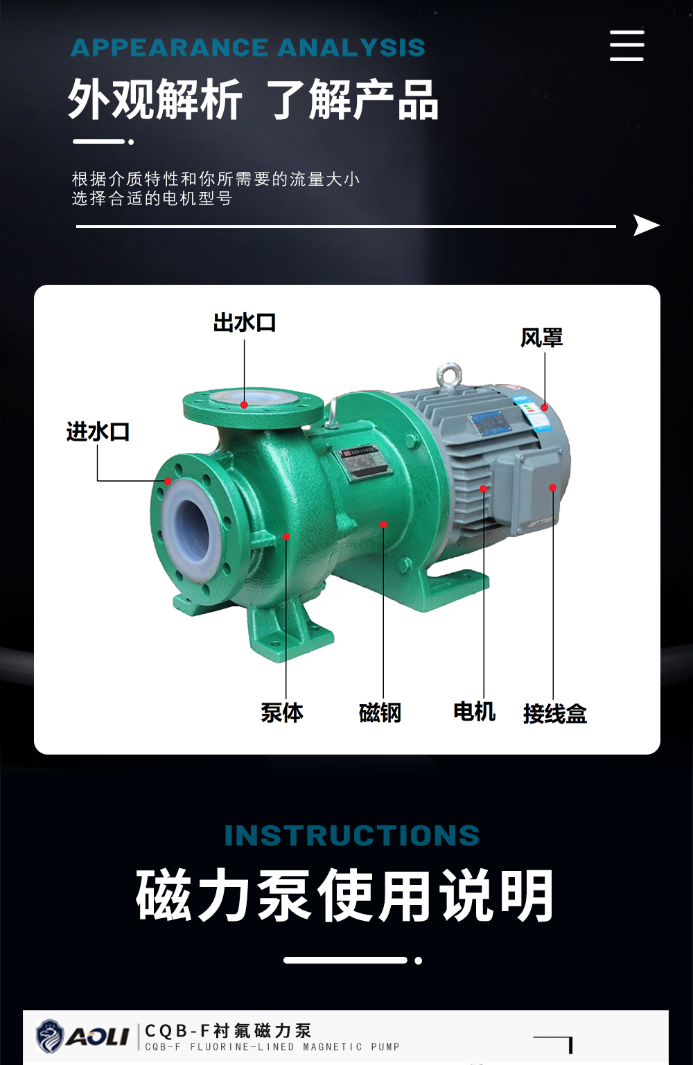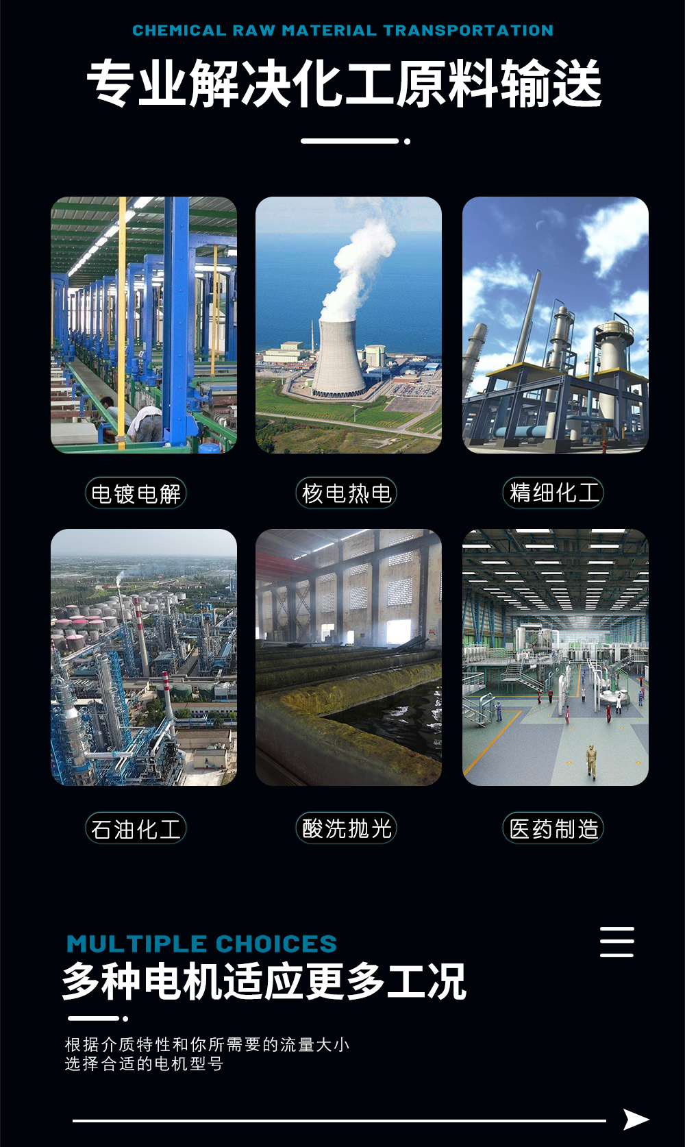 CQB-F氟塑料磁力泵采用磁力耦合傳動(dòng),不存在動(dòng)密封點(diǎn),因此防止了一般軸傳動(dòng)式離心泵軸封外跑、冒、滴、漏的現(xiàn)象的塑料磁力泵類型。過(guò)流部件采用氟塑料及高純度工業(yè)陶瓷制成,具有優(yōu)異的耐腐性及密封性,因此本產(chǎn)品被廣泛適用于化工、制酸、制堿、冶煉、稀土、農(nóng)藥、染料、醫(yī)藥、造紙、電鍍、電解、酸洗、無(wú)線電、化成箔、科研機(jī)構(gòu)、國(guó)防工業(yè)等行業(yè)??奢斔徒橘|(zhì):輸送任意濃度的酸性、堿性、油類、稀有貴重液體、毒性液體、揮發(fā)性的化學(xué)介質(zhì)。特別是易燃、易漏、易爆液體化學(xué)介質(zhì)的輸送。