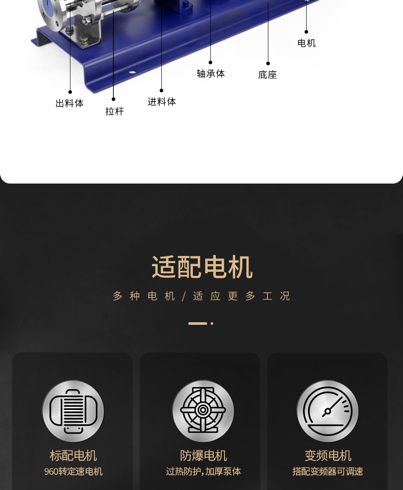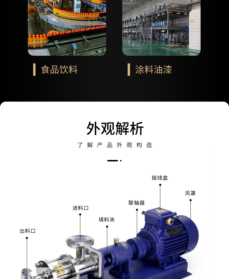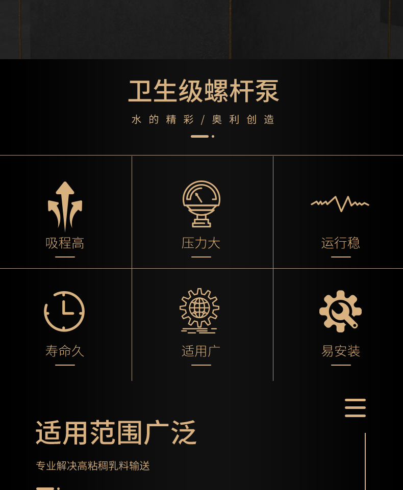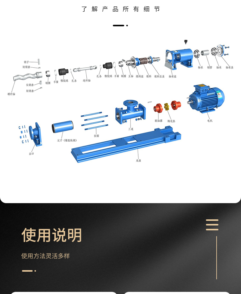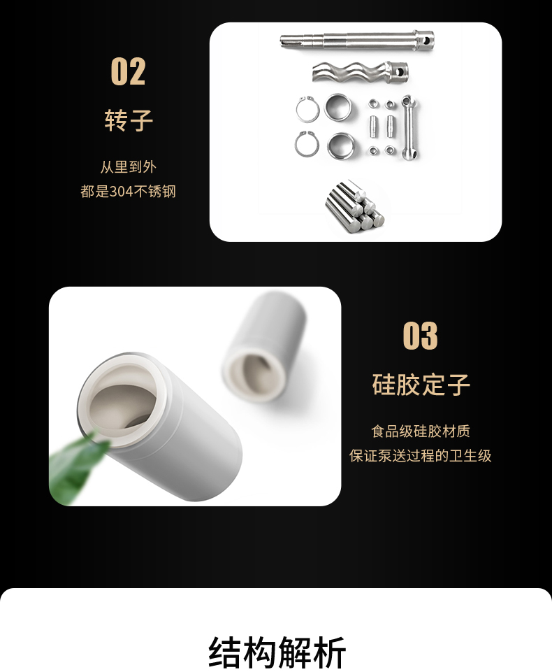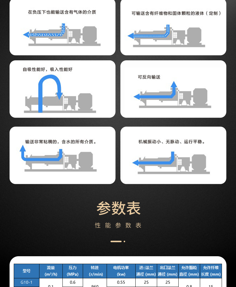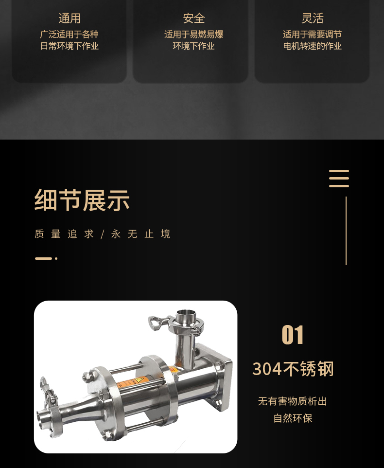 衛(wèi)生級螺桿泵是按迥轉(zhuǎn)嚙合容積式原理工作的新型泵種,主要工作部件是偏心螺桿(轉(zhuǎn)子)和固定的襯套(定子)。由于該二部件的特殊幾何形狀,分別形成單獨的密封容腔,介質(zhì)由軸向均勻推行流動,內(nèi)部流速低,容積保持不變,壓力穩(wěn)定,因而不會產(chǎn)生渦流和攪動。每級泵的輸出壓力為0.6MPa,揚程60m(清水), 適用于輸送介質(zhì)溫度80℃以下(特殊要求可達150℃)。因定子選用多種彈性材料制成,所以這種泵對高粘度流體的輸送和含有硬質(zhì)懸浮顆粒介質(zhì)或含有纖維介質(zhì)的輸送,有一般泵種所不能勝任的特點。其流量與轉(zhuǎn)速成正比。
